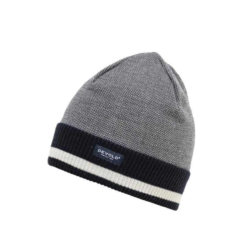 Vatne Merino Beanie er en melert unisex-lue laget av 100 % ny ull. Den er myk og varm, med ribbestrikket kant og Devold-logo på forsiden.