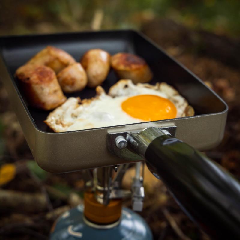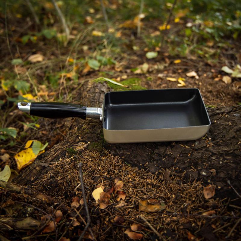 Rektangulær non-stick stekepanne, 13×18 cm. Full kontroll på innholdet og markert «hellekant» i fronten gjør produktet unikt. God design for ryggsekk.