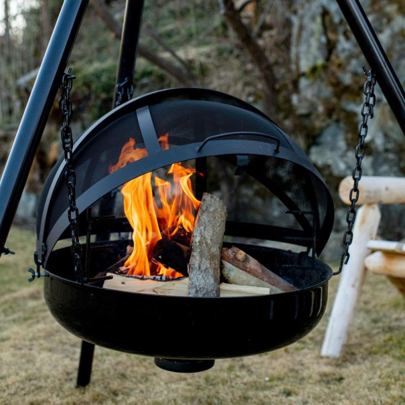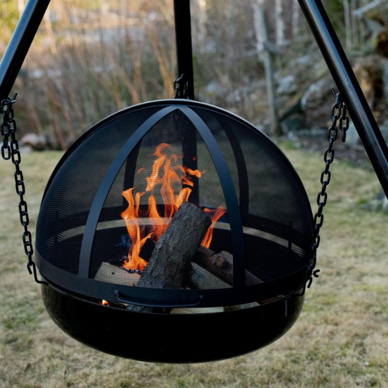 Så kan du kose deg ekstra når du lager bålet litt større neste gang. Halvkulen settes direkte på bålpanna og festes med tre vingemuttere. Gnistfangeren kan åpnes halvveis slik at man kan legge på ved eller snu maten under grilling. Produsert i syrefast, svartlakkert stål og passer til Bålpanne 60 og Fyrfat 60.