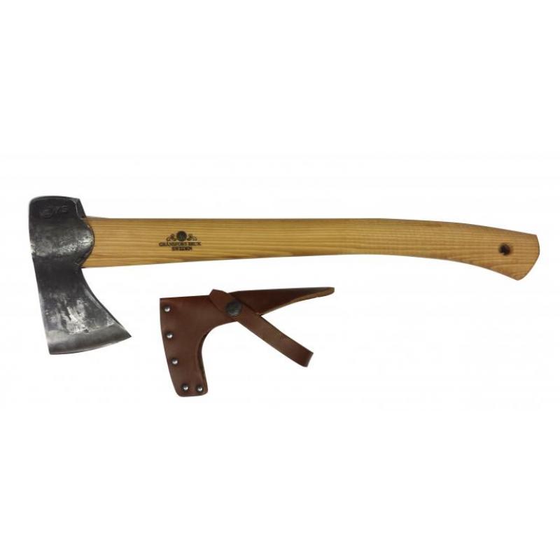 Øksen er total 35 cm lang, veier kun 06, kg og har eggbeskytter i lær. Øksen leveres med 20 års garanti.