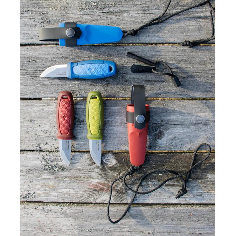 Det ergonomiska spolformade skaftet av polymer har ett mjukt friktionsgrepp, fingerskydd och ett 2,0 mm tjockt profilslipat blad av återvunnet svenskt rostfritt stål, som ger både styrka och stabilitet i varje skär. Knivslidan av polymer är symmetrisk vilket innebär att den passar både höger- och vänsterhänta. Morakniv Eldris med Tändståls-kit tar dig till nästa nivå med paracord och sekundärlås som gör att du kan bära kniven som du vill. Dessutom ingår ett tändstål som tänder gnistan till lägerelden. Kan kompletteras med Morakniv Bältes-loop till Eldris, Garberg, Kansbol.