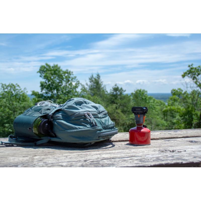 Backpacker benytter gasstank som Apparatet bruker 1,3g gass i timen, og en 100g gassbeholder gir 90 timer effektiv brukstid.