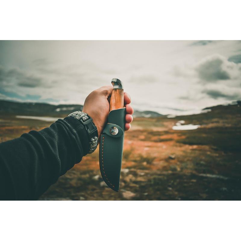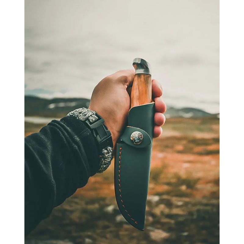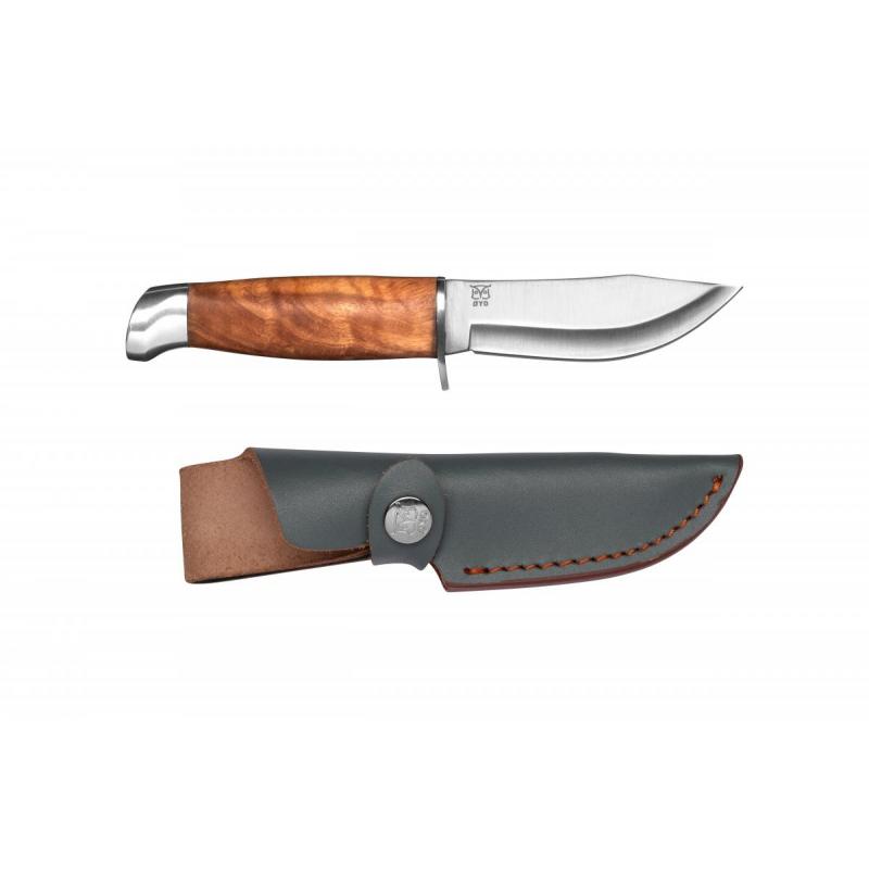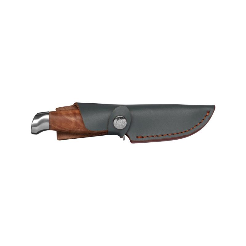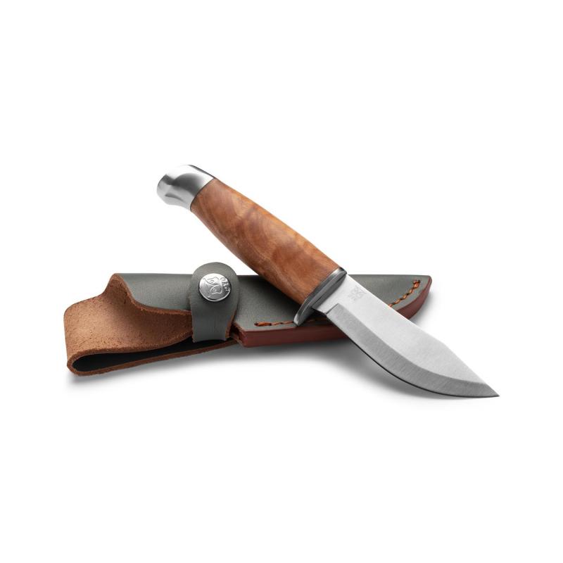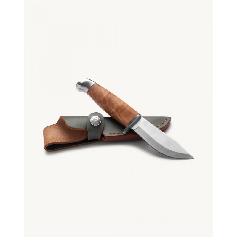 Geilo junior slirekniv er det naturlige valget av kniv når man har vokst fra speiderkniven eller bare ønsker en litt mindre kniv. Geilo junior er god til spikking av bålflis, pølsepinner og andre oppgaver som krever en skarp turkniv. Knivbladet som er kon- og hulslipt er smidd i et premium stål. Det at knivbladet og skaftet i oliventre er mindre enn på de andre knivene gjør at den er god å holde for små hender. En fingerstopper bidrar også til et godt og sikkert grep. Kniven ligger i en petroleumsblå lærslire med knapp for sikker oppbevaring.