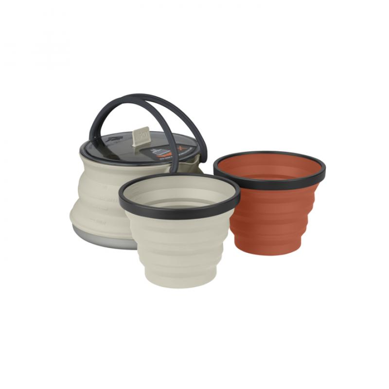 Kjelen er liten, lett og sammenleggbar. De følger også med to sammenleggbare kopper. Kjelen kan brukes på gassbrenner.