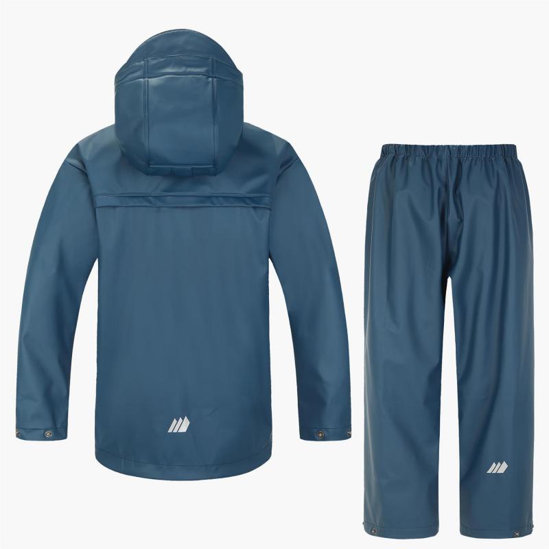 Regnsett i PU-materiale. Skjult glidlås i front på jakke, elastisk linning med snorstramming.