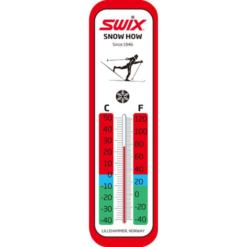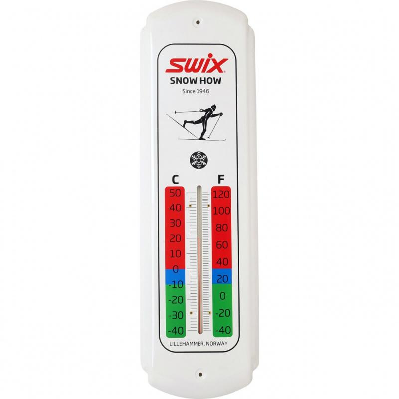 Rektangulært veggtermometer for innendørs eller utendørs bruk. -40°C/+50°C. Fargekodet iht. til SWIX skivoks. 43,5 cm x 12,8 cm / 17,1 tommer x 5 tommer.