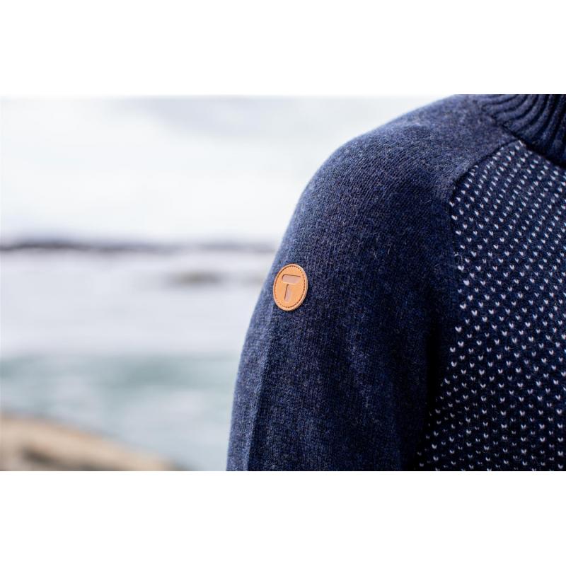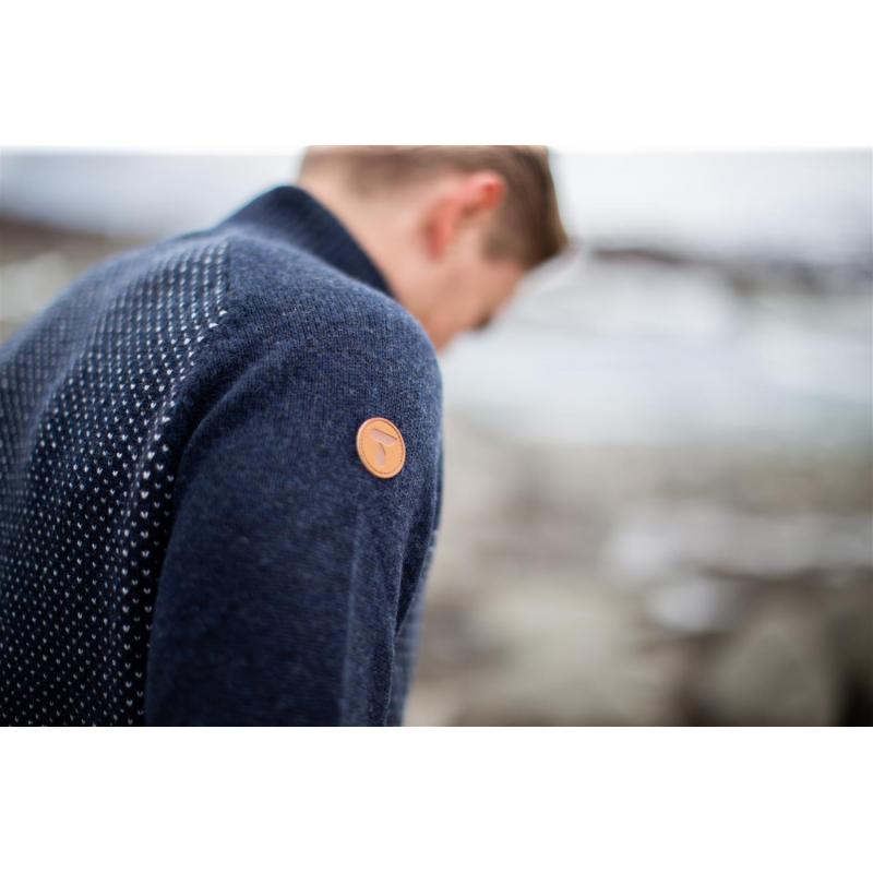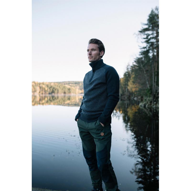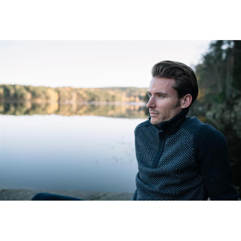 En høyhalset, tykk og komfortabel ullgenser med mønster. Halsen er en litt lav høy hals, noe som gjør genseren mer allsidig til hverdagsbruk samtidig som den er knallfin på tur i det fri. Genseren er laget av en unik blanding av tykk, varm lammeull spunnet sammen med myk bambusviskose og modal fibre. 100 % superfin merinoull er blandet sammen med lammeullen på innsiden av halsen og i bunn av ermene, for å beskytte mot unødvendig kløe der huden er mest sensitiv.