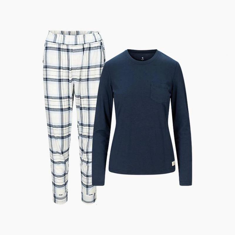 Ta på deg en Tufte-pysjamas og du er garantert en komfortabel natt, eller en skikkelig god start på dagen. Denne pysjen til dame fra Tufte har bukser vevd av bambusviskose og økologisk bomull i et tidløst mønster, og har et løst og behagelig snitt. Genseren er iblandet elastan for utrolig komfort uansett hvordan du sover.